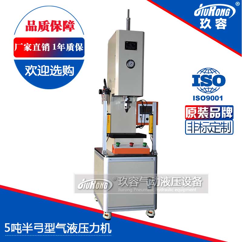 1、外形尺寸約為620*650*2010; 2、裝模尺寸:工作臺尺寸350*240*35,開模高度250,喉深123; 3、裝模方式:上模連接在上模模頭的25內孔處,下模使用螺栓或T型螺母連接到在工作臺上的T型槽上; 4、增壓缸出力參數: 增壓缸型號為JRB-80-100-10L-5T-10B,總行程100mm(含增壓行程10mm/可調增壓行程10mm); 當氣源壓力為0.6mpa時,理論預壓出力為300kg,理論增壓出力為6000kg,理論回程拉力為240kg,所有氣口在左側面,均為ZG3/8"; 5、控制方式:正前面底部附帶一操作按鈕盒,其中左右側各附一個雙手啟動按鈕,中間為急停按鈕; 6、電控部分:配我司標準型PLC電控箱; 7、安全防護:使用了英邦NA10-28SE安全光柵組件,最小檢測物體高度15mm,保護高度270mm。 注:以上數據均可非標定制。 | ![]() |